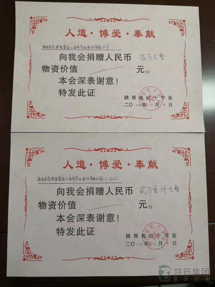 近期,一場突如其來的新型冠狀病毒肺炎疫情牽動著全體山海丹人的心。災難無情,公司有愛,作為一個有責任、有擔當、有愛心的企業,陜西醫藥控股集團山海丹藥業股份有限責任公司黨委向全體員工發出了捐款倡議書,全員上下積極響應,踴躍捐款。2月10日,公司將161名員工的愛心捐款21000元以及公司捐助的50000元經由陜西省紅十字會平臺定向捐贈給陜西省新冠病毒防控指定醫院,用于購買醫護人員所需防疫物資,陜西省紅十字會對于公司義舉給予了充分肯定。